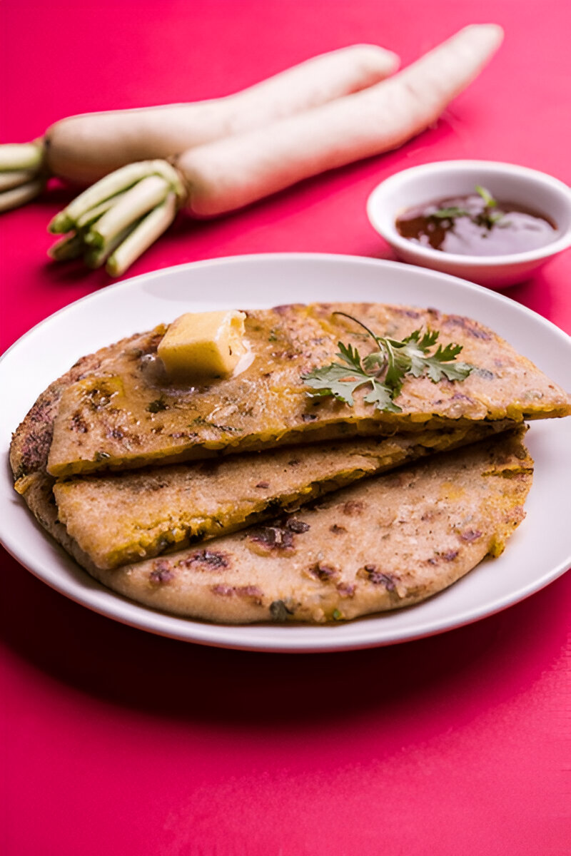 Whole wheat flour Medium-sized radish (mooli) grated, Cumin seeds, Ajwain (carom seeds) Red chili powder Salt to taste Fresh coriander leaves, Water for dough Ghee or oil for cooking