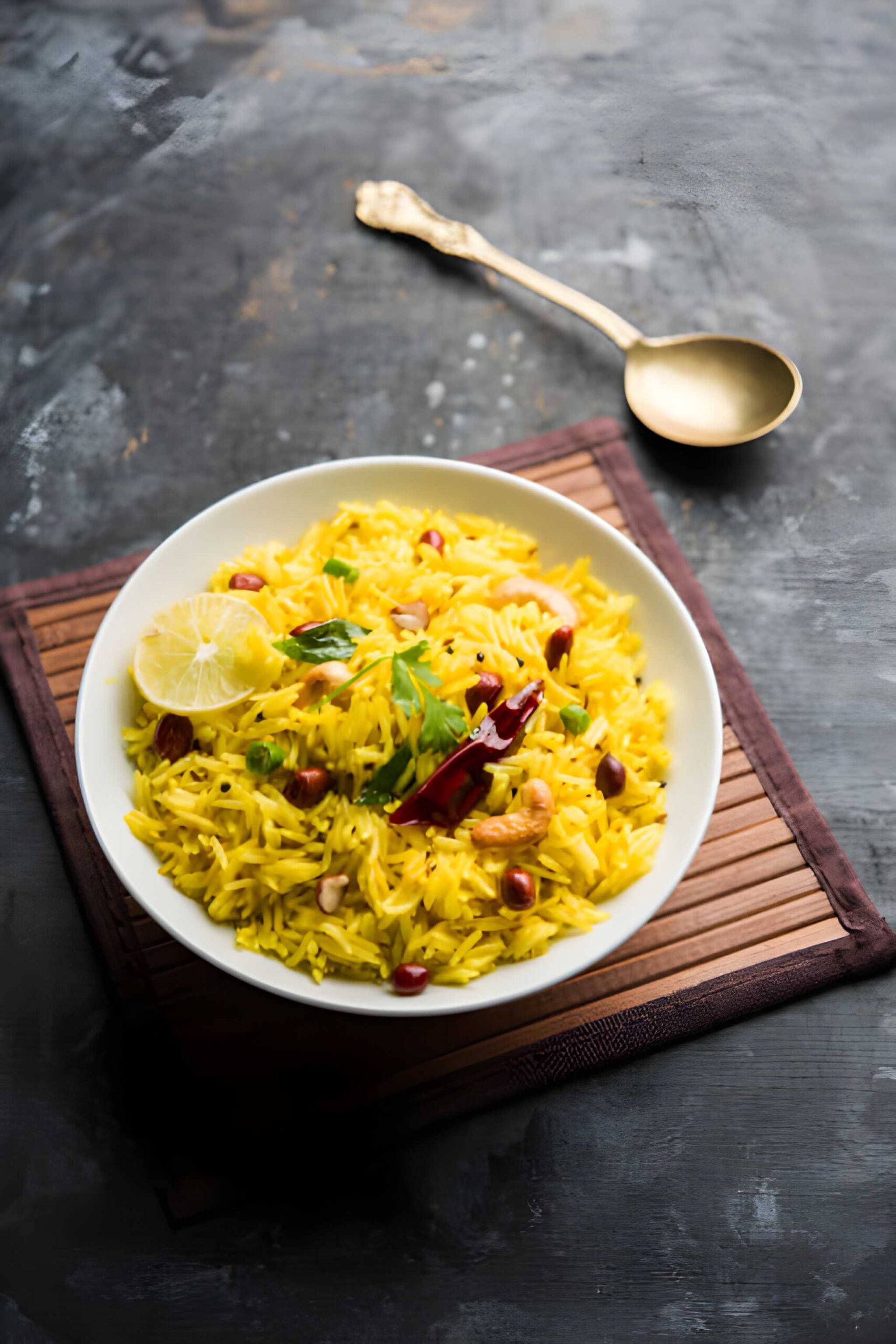 Basmati rice Lemon Oil or ghee Green chilies Peanuts Curry leaves Mustard seeds Chana dal ,urad dal Turmeric, Salt Cashew nuts