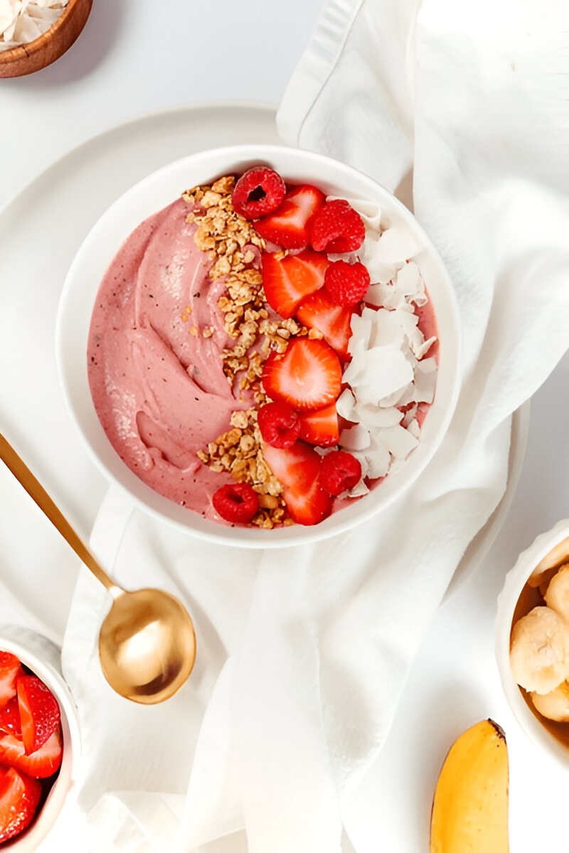 A Strawberry Smoothie Bowlis a thick, fruity blend topped with fresh fruits, nuts, seeds & granola. Perfect for breakfast or a post workout treat – creamy, colorful, and full of nutrients